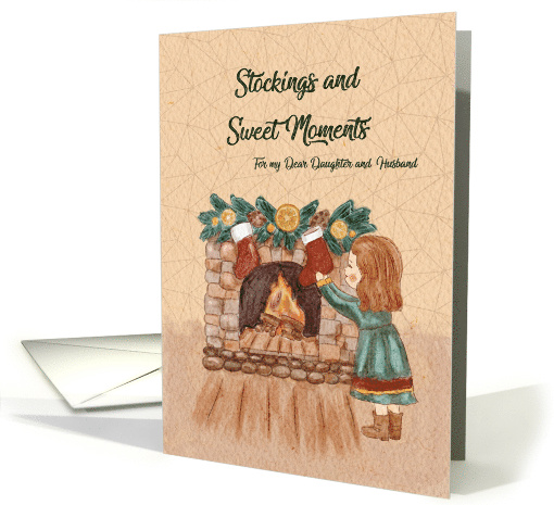 A watercolor-style Christmas card featuring a young girl hanging red stockings on a stone fireplace. Above the fireplace, there's a festive garland made of pine leaves, pinecones, and dried orange slices. A cozy fire glows in the hearth. The text on the front reads “Stockings and Sweet Moments.For Daughter and Husband