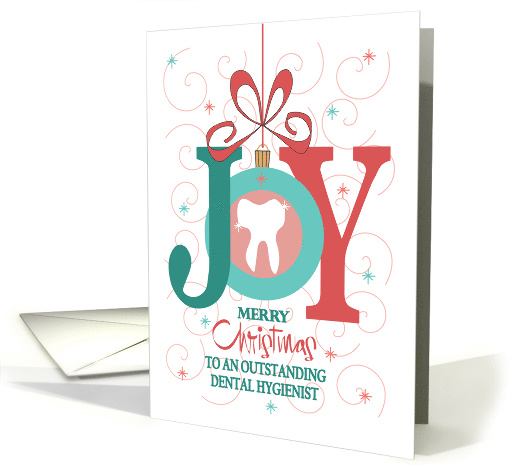 This fun holiday card for a special Dental Hygienist, whether they work in your Dental Office or they are the special person who clean and check your teeth periodically, will brighten their holiday. The large word "JOY" fills the sparkling white card, that has sparkles that match the white sparkles along the side of the large, white tooth at the center of the ornament created by the letter "O" in the middle of the word "JOY". Additional words, below, say "Merry Christmas to an outstanding Dental Hygienist". The card's inside wording says "Wishing you joy at the holidays and a wonderful New Year!"