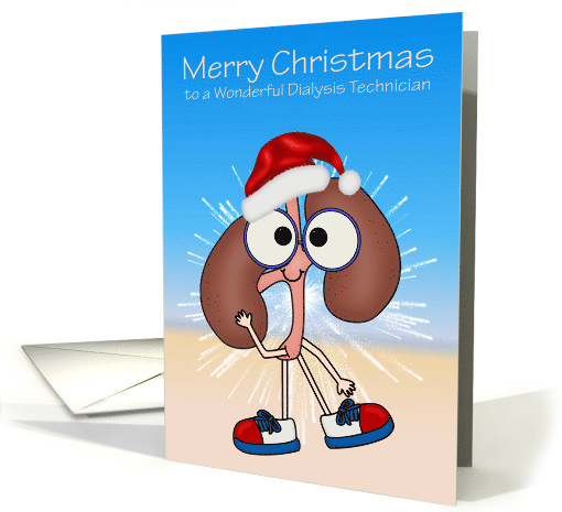 Wish a dialysis technician a Merry Christmas with a card featuring a happy, smiling kidney wearing a cute Christmas stocking cap, eye glasses and red, blue and white sneakers against a soft gradient background with white fireworks. Inside like all Greeting Card Universe cards can be personalized by you if you wish to give it your own personal touch. Design by Laurie Schneider, elements by Scrappin Doodles, MarloDee Designs, Digital Designs by Elena, Diana'z Designz. FYI The first successful dialysis was performed in 1943. The kidneys have an important role in maintaining health. When the person is healthy, the kidneys maintain the body's internal, equilibrium of water and minerals, sodium, potassium, chloride, calcium, phosphorus, magnesium, sulfate. The acidic metabolism end-products that the body cannot get rid of via respiration are also excreted through the kidneys.