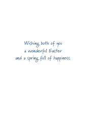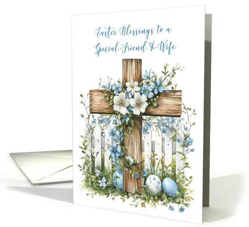 Easter is a time of renewal and joy, and this thoughtful card is a perfect way to celebrate a special friend and his wife. Featuring a rustic wooden cross adorned with soft blue flowers against a charming white fence, the design captures the beauty of the season. Inside, a warm and cheerful message extends Easter wishes and the hope of a bright and happy spring, making this a meaningful way to let them know you're thinking of them.