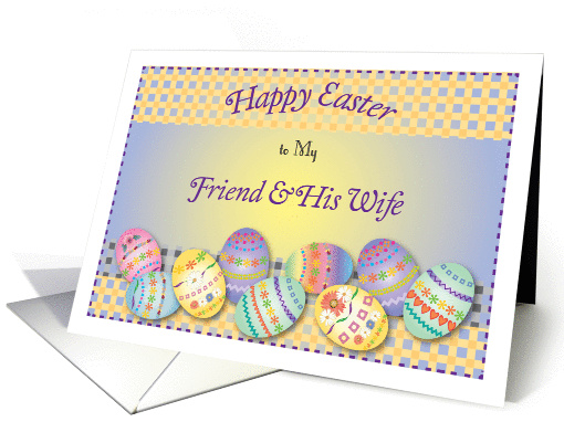 This is an Easter card for a friend and his wife, featuring decorated eggs on a basket weave background. You may change the inside message at checkout, if you wish.