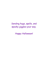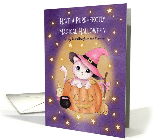 This Halloween greeting card features a watercolor illustration with a soft pastel palette. A pink-and-white kitten sits inside a carved jack-o’-lantern with a smiling face. The cat wears a pink witch hat with a black band and golden buckle. To the left, there is a lit white candle and a small black cauldron filled with pink candy. To the right, a broom with a pink bow leans against the pumpkin. The background fades from deep purple to warm golden tones, creating a glowing effect. White and pale yellow stars are scattered throughout the scene. At the top, in white uppercase letters, the text reads: “Have a Purr-fectly Magical Halloween. For granddaughter and husband