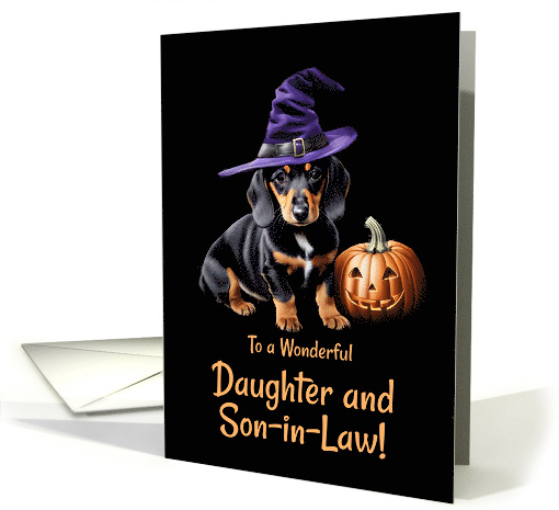 Happy Halloween with an adorable Dachshund pup, a jack-o'-lantern, and a playful inside greeting as well, perfect for your daughter and son-in-law.