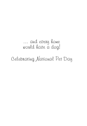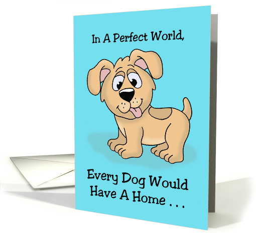 National Pet Day Card (April 11th) with a cartoon of a cute dog on a blue background. The words say, In a perfect world, every dog would have a home ... Inside says, ... and every home would have a dog! Celebrating National Pet Day