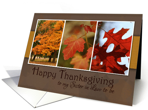 Some warm and season Thanksgiving wishes will be on their way to your future sister in law with this card featuring lovely fall foliage photographs in a "snapshot/Polaroid style" A textured golden ribbon runs behind the photographs at the middle of the card with a shadow effect behind. The text is a deep brown with the words "Happy Thanksgiving to my Sister in law to be"
