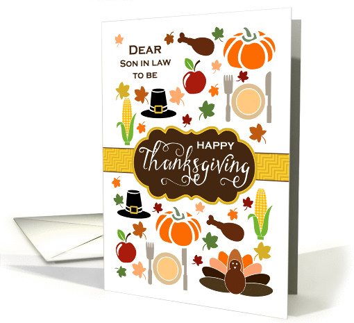 Sweet fall icons of turkey, Pilgrim hat, pumpkin, drumstick, apple, plate, fork and knife, corn and colorful autumn leaves in dark red, orange, red and green form a trendy, ornate and very cute Thanksgiving icons card for your future Son in Law.