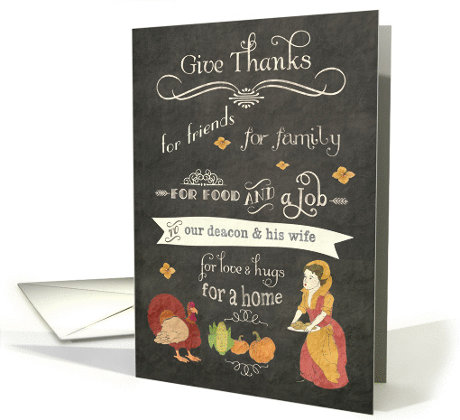 This trendy Christian Thanksgiving chalkboard effect card for your deacon and his wife features a vintage inspired grungy chalkboard with eroded text, pumpkins, a turkey, corn and a pilgrim woman. You can edit/add text inside card (scripture 1 Chron. 16:34). Custom requests welcome.