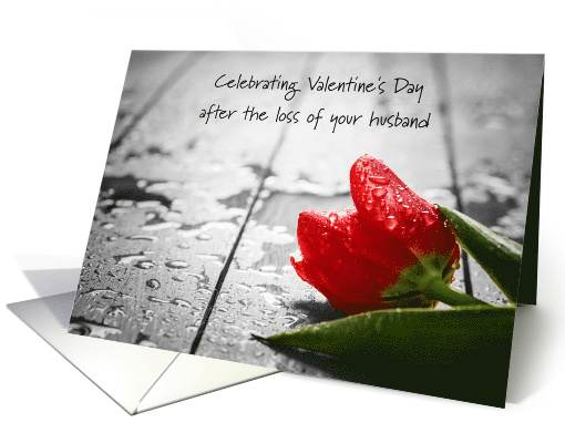 The love for your husband will last a lifetime. That same love remains even when he has passed away. Valentine's Day for a grieving wife isn't easy. A special first Valentine's Day alone rose on a wet porch card to bring comfort on Valentine's Day.