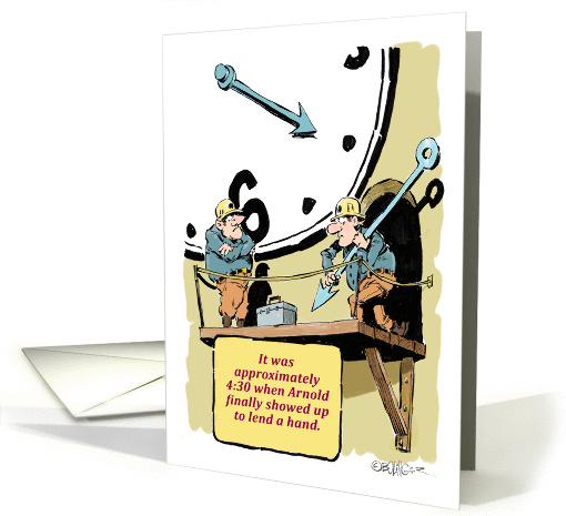 The cartoon workmen are fixing the town clock, almost on schedule. They have created the perfect excuse for you not getting the birthday card you wanted on time. Lucky you ... give yourself a hand.