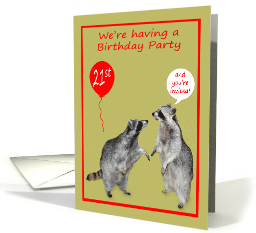 Invitations for your guests to a 21st Birthday party with a card featuring two adorable raccoons. Bullwinkle is talking while Rocky is looking at him attentively on a light green background with a red balloon and border. A cute invitation anyone will love!