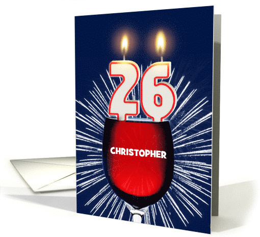 26th birthday party invitation with a big glass of red wine. Add a name to personalize this unique invite. Fireworks are exploding in the background. Floating in the wine are birthday candles.