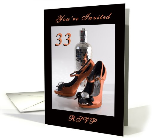 A 33rd birthday party invitation featuring a photograph of beautiful orange designer party shoes and a sparkly cocktail shaker! Check out my store for other ages/invitations.
