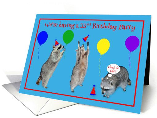 Invitations for your guests to a 33rd Birthday party featuring three adorable raccoons, Bullwinkle is wearing a hat, Rocky is throwing his in the air while Sugar Bear has his in front of him and is sticking out his tongue saying where's the cake. A cute party invitations anyone will love.