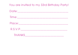 Inside: You are invited to my 33rd Birthday Party! Date:__________________________________ Time:__________________________________ Place:_________________________________ R.S.V.P._______________________________ THANKS__________________________