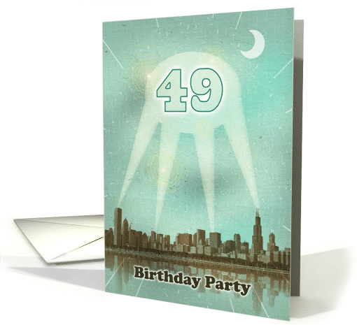 49th birthday party invitation with a movie poster look. Spotlights shine the age over a city by a river. A great birthday party invitation to a party for someone very special.