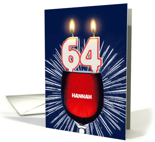 64th birthday party invitation with a big glass of red wine. Add a name to personalize this unique invite. Fireworks are exploding in the background. Floating in the wine are birthday candles.