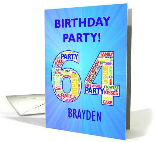Add a name to make super unforgettable 64th birthday party invitations. The numbers are made from words connected with birthdays to get everyone in the mood!