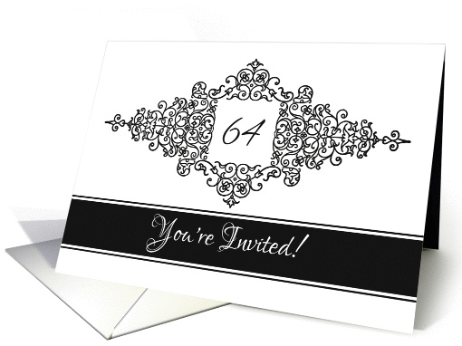 A formal invitation card in black and white for a 64th Birthday Party with "64" in a flourish frame. You can customize the inside text to show the occasion, date, time, place and contact details.