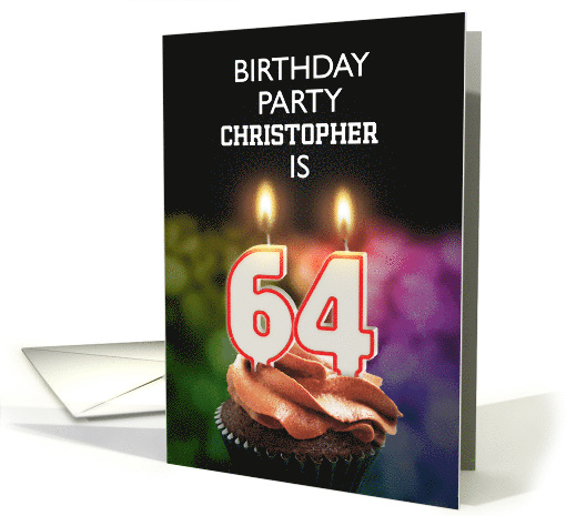 64th Birthday Party Invitation. Add a name to customize this card with burning candles on a cupcake. A great birthday cake on a birthday party invitation card. Suitable for a male or female.