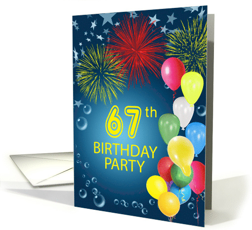 67th birthday party invitation. Invite friends and family to a birthday party. Exploding fireworks, stars, and bubbles add to the fun. A joyful birthday party invitation.