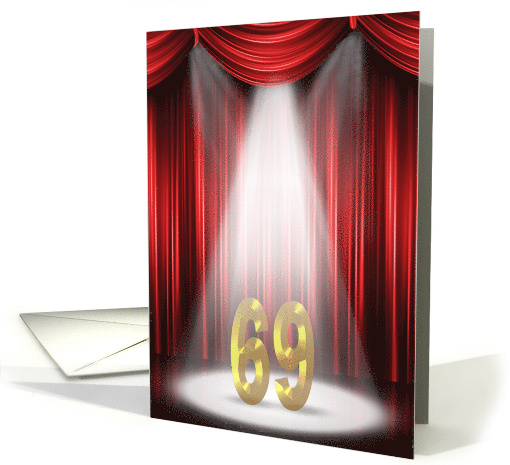 Gold 69 text in spotlight on stage with red curtains for 69th birthday party invitation.
