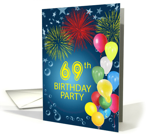 69th birthday party invitation. Invite friends and family to a birthday party. Exploding fireworks, stars, and bubbles add to the fun. A joyful birthday party invitation.