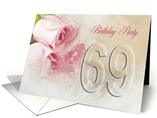 69th birthday party invitation featuring three pink roses and feathers. Invite friends and family to your party with a card that is truly feminine.