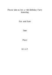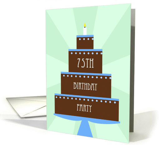 This 75th birthday party invitation features a four layer chocolate cake with blue icing on a green background. The words "75th Birthday Party" are written on the layers of the cake to make a fun 75th birthday party invitation.