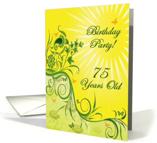 75th birthday party invitation. A beautiful birthday party invite. Flowers and butterflies against a brilliant sunshine yellow background.