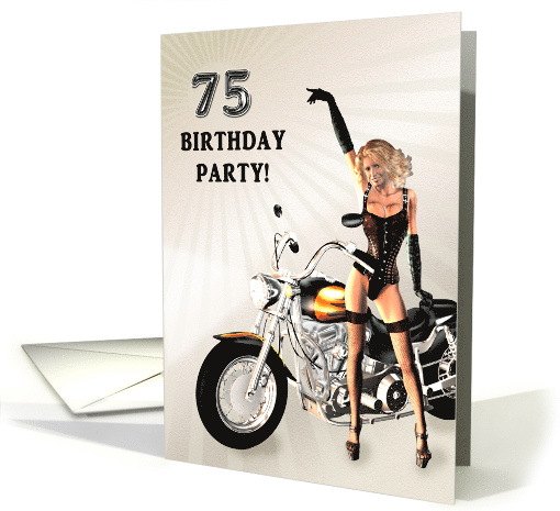 75th Birthday party invitation with a sexy girl wearing a basque and long black gloves points seductively at an invitation to a 100th birthday party. She is stood next to a big motor-bike.