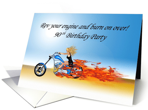 90th birthday party invitation. Revving up and burning over! A blond, on a burning motorbike with flames waving behind, riding fast with your party invitation!