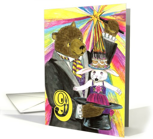Poof - Birthday Magic, © Diana Ting Delosh. Ink and watercolor illustration. Bear, the magician waves his wand and magically, bunny and birthday cake pop out of his hat. Feel free to change the inside greeting