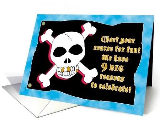 High-flying pirate flag birthday party invitation. Please add your specific party details to the inside of this card, either by clicking the 'personalize' button while online, or by handwriting when your cards arrive.