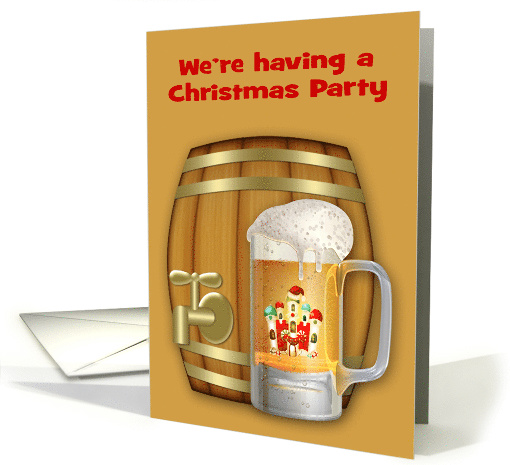Invitation to Christmas Party with a Foamy Mug of Beer and a Mini Keg
