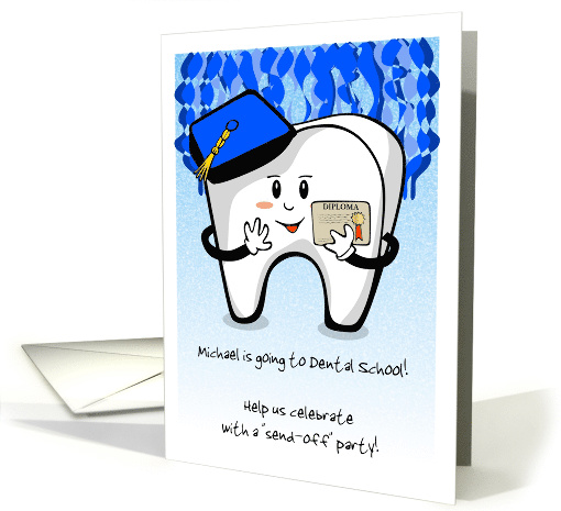 Graduate is off Tooth Dental School! Party Invite Card - LD Gonzalez 2016 Celebrate your child or friend going to(oth) dental school. Personalize with your graduate's name on outside and invite information inside. Illustration by LD Gonzalez.