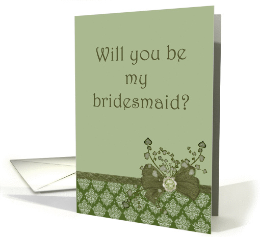 Use this feminine card to request a friend or relative to be your bridesmaid. This is a card with a soft green background and flowing text. The design on the card is a graphic of white lace with a green ribbon and a jeweled bow hold a sprig of greenery with heart shaped leaves. One of a series of cards of this design. Other cards for the wedding party are available. All the elements of this design are digital and will be printed on the card.
