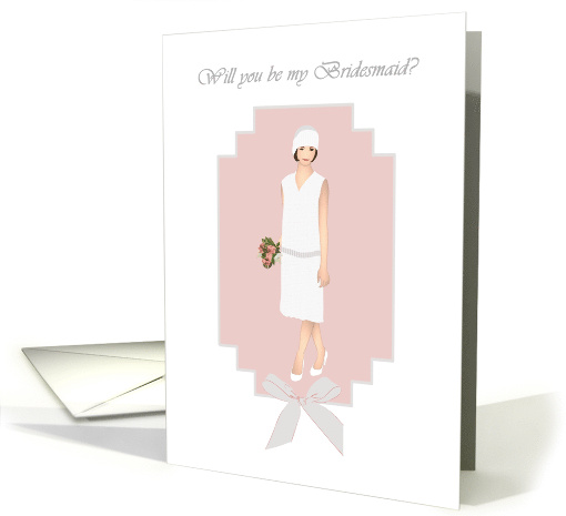 A bridesmaid in a vintage dress and hat, carrying a small bouquet of roses. The drawing is placed in an art deco frame with a dusky rose pink background and a grey ribbon.