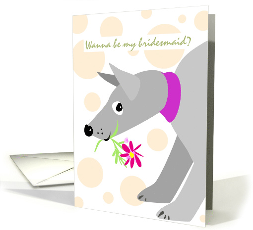 Wanna be my bridesmaid? Cute little gray dog holding a raspberry pink daisy in his mouth on a background of pink polka dots.