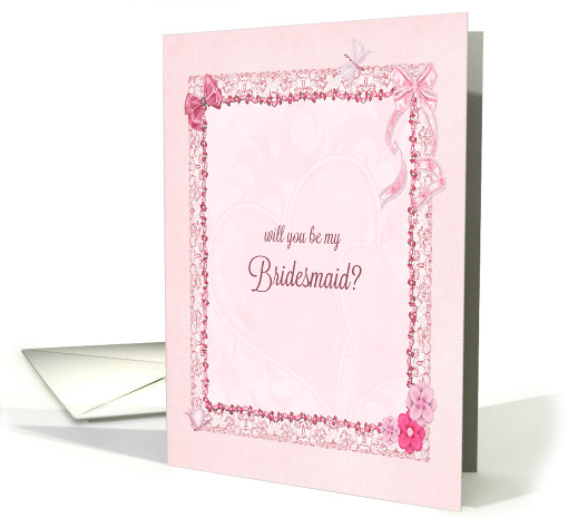 Invitation to your goddaughter to be your bridesmaid. A card that will delight the recipient.A gorgeous scrap-booking craft-look card. With lots of flowers and butterflies, this card is sure to delight. Create a coordinated look with matching cards and invitations. Note, this card is printed, not hand made.