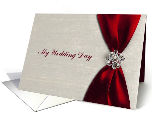 Invitation, Bridesmaid, Scarlet Red Satin Ribbon with Jewel.The ribbon & jewel are NOT real tangible elements. Digital art is used to create a ribbon-like and a jewel-look on the card. Available in other colors. Search Satin Ribbon for the selection. Requests are welcome! The inside text of all car