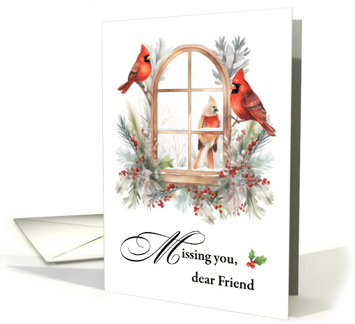 A warm winter scene of cardinals perched at a snowy window decorated with evergreen and berries. Designed to let a friend know they are missed, this card conveys heartfelt care and a message of friendship.