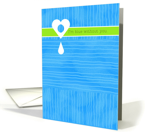 Let someone know how much you miss them with this sweet blue card featuring a heart with teardrop, hand drawn style stripes and thin green banner with text I'm blue without you. Original design by S. Fernleaf