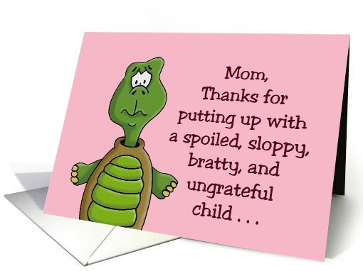 Humorous Birthday card for mom/mother, with a cartoon turtle and the words: Mom, thanks for putting up with a spoiled, sloppy, bratty, and ungrateful child ... Inside says: ... like my sibling! Happy Birthday