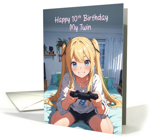 Celebrate a rare and special bond with this joyful anime-style card for your twin’s milestone 10th birthday. The artwork shows a cheerful blonde girl seated cross-legged on her bed, gaming controller in hand, her blue eyes sparkling with playful excitement. Her long twin ponytails and relaxed clothes reflect her fun-loving personality, while her softly lit bedroom—featuring floating shelves, leafy plants, and neatly made bedding—adds warmth and charm. A bright pink “Happy 10th Birthday” message floats above, perfectly marking the occasion. Whether you’re sharing laughs, adventures, or just quiet moments together, this card captures the joy of being twins—a reminder that no matter where life takes you, you’ll always have each other.