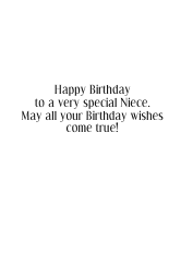 This darling card for your Niece's Birthday depicts a tiny girl of Asian decent, seated at her Third Birthday Celebration, surrounded by her white and pink frosted cake, topped with three candles, and a polka dot gift, next to her favorite stuffed bear. Above her are several hanging lanterns, one with her new age written on it, with a huge black 3 centered at its center. Flowers decorate her black hair for the party and her dress is decorated with matching floral buttons. The inside wording of the card is "Happy 3rd birthday to a very special Niece. May all your birthday wishes come true!"