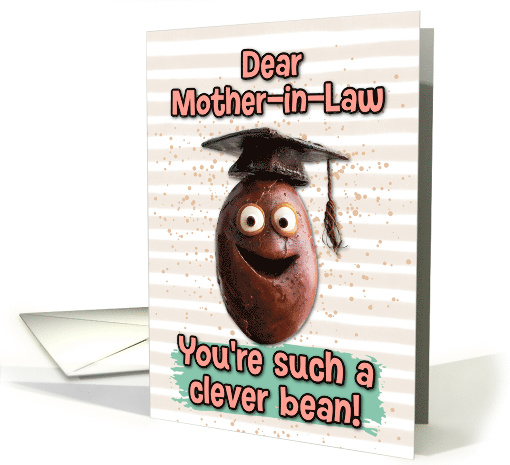 A proud graduate bean wearing a mortarboard on its head with a tassle on a beige striped watercolor background with splatter effect and the text "Dear mother-in-law you're such a clever bean!" A fun pun card to send to that newly graduated mother in law