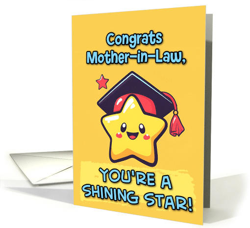 A proud graduate kawaii cartoon star wearing a mortarboard on its head with a red tassle on a yellow background with the text "Congrats mother-in-law, you're a shining star!" A fun card to send to that newly graduated mother in law