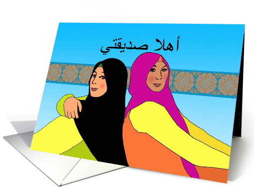 Friendship card written in Arabic. Ahlan sadiqati, Hey or Hello Friend written in Arabic. Illustration of two women wearing hijabs and sitting back to back next to a blue wall with ornate tiles. Women thanks to:Publicdomainpictures and tile element from:Openclipart