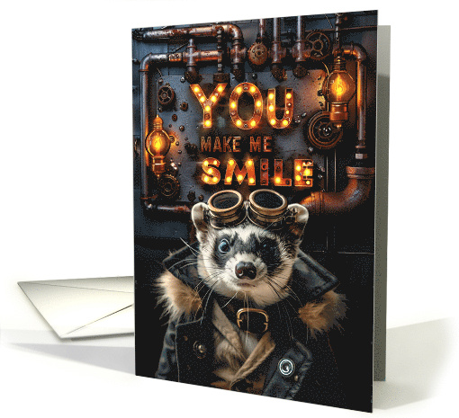 A ferret scientist wearing goggles in front of their latest invention, a machine with gears, tubes and stuff that lights up and the text 'You make me smile'. A great card to send to your steampunk loving friend to let them know how much you value their friendship.