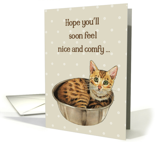 This card features my artwork of a little Bengal kitten curled up inside a stainless steel bowl. Words say, "Hope you'll soon feel nice and comfy ...". The card continues inside with the words, "... in your new home. You will be missed!".